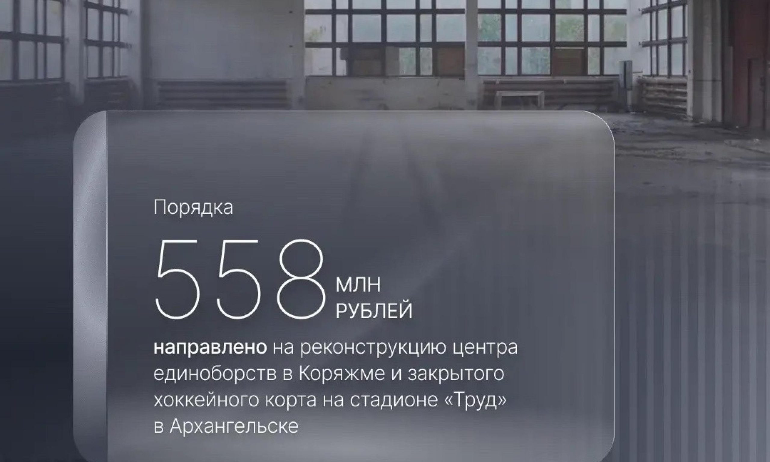 В 2026 году модернизируют центр единоборств в Коряжме и хоккейный корт на стадионе «Труд» в Архангельске. Оба проекта получили поддержку из федерального бюджета, общий объем финансирования составит около 558 млн рублей. Об этом сообщил губернатор Архангельской области Александр
