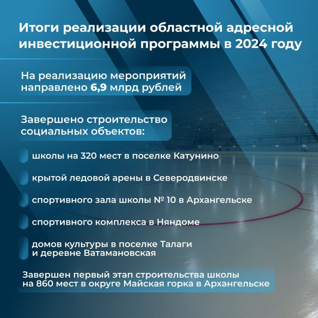 На реализацию областной адресной инвестиционной программы в 2024 году было направлено 6,9 млрд рублей, из них 3,1 млрд — из федерального бюджета, 3,5 млрд рублей — из областной казны. Еще 300 млн рублей были привлечены в рамках соглашения с ПАО «Газпром». Об этом в своем телеграм-канале сообщил губернатор Архангельской области Александр Цыбульский. Он пояснил, что эти средства направили на реализацию социально значимых проектов. Например, построить школу в Катунино, приобрести квартиры для сотрудников бюджетной сферы, провести […]